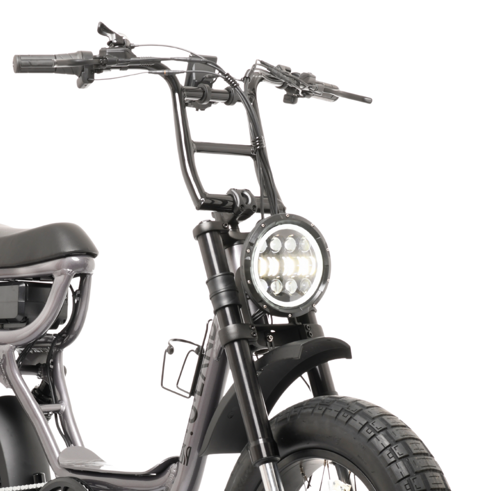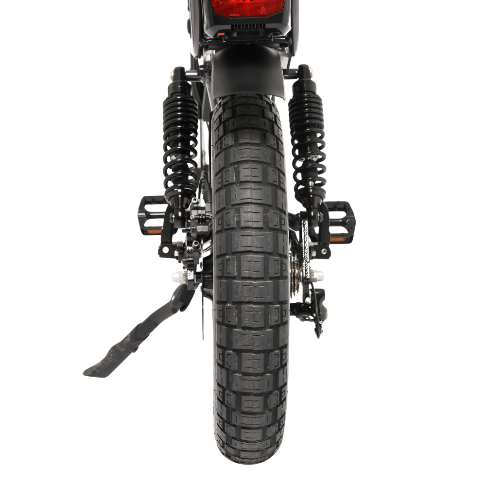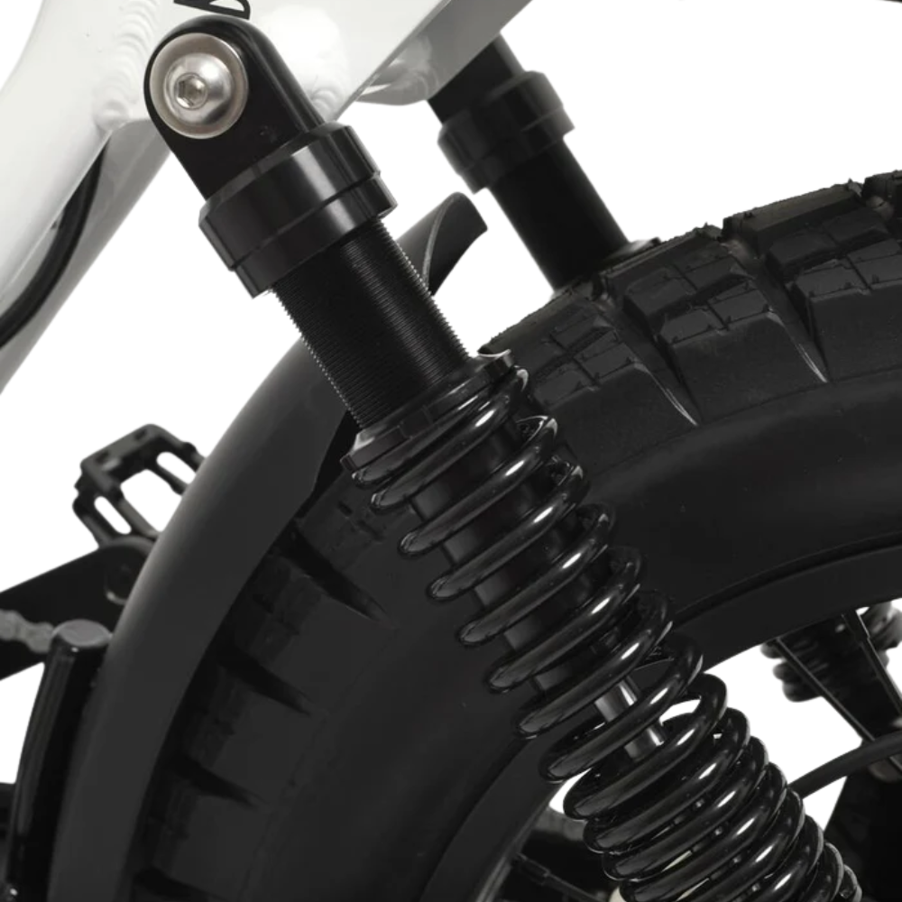 The dual suspension system absorbs shocks and bumps, making it ideal for both off-road adventures and daily commutes. Paired with 20” x 4” fat tyres, a front suspension fork, and a lightweight aluminium frame, it delivers a stable, cushioned ride across any surface.